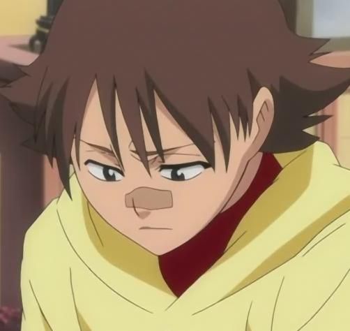 Der Junge hat dunkle, kurze Haare die ihm zerzaust in sein Gesicht fallen. Seine braunen Augen scheinen Dich traurig anzusehen. Auf seiner Nase befindet sich ein kleines Pflaster, das von wilden Raufereien herrühren mag.